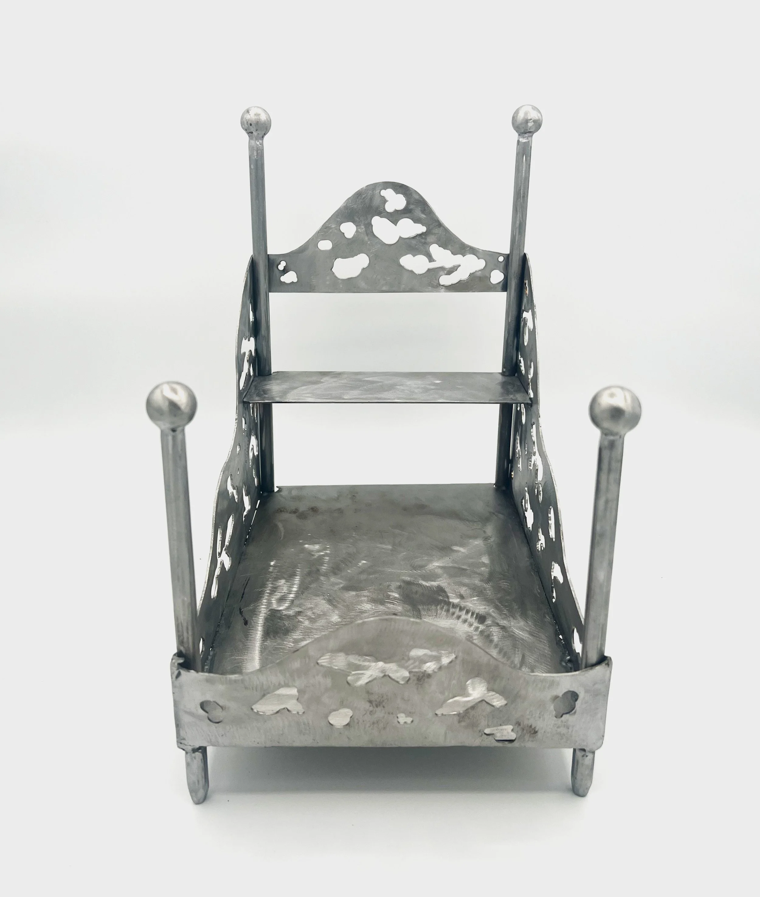 Miniature metal bed-shelf-vessel with 8 harness weaving sample; cutouts inspired by the shadows of dappled light. A resting spot for trinkets + thoughts.